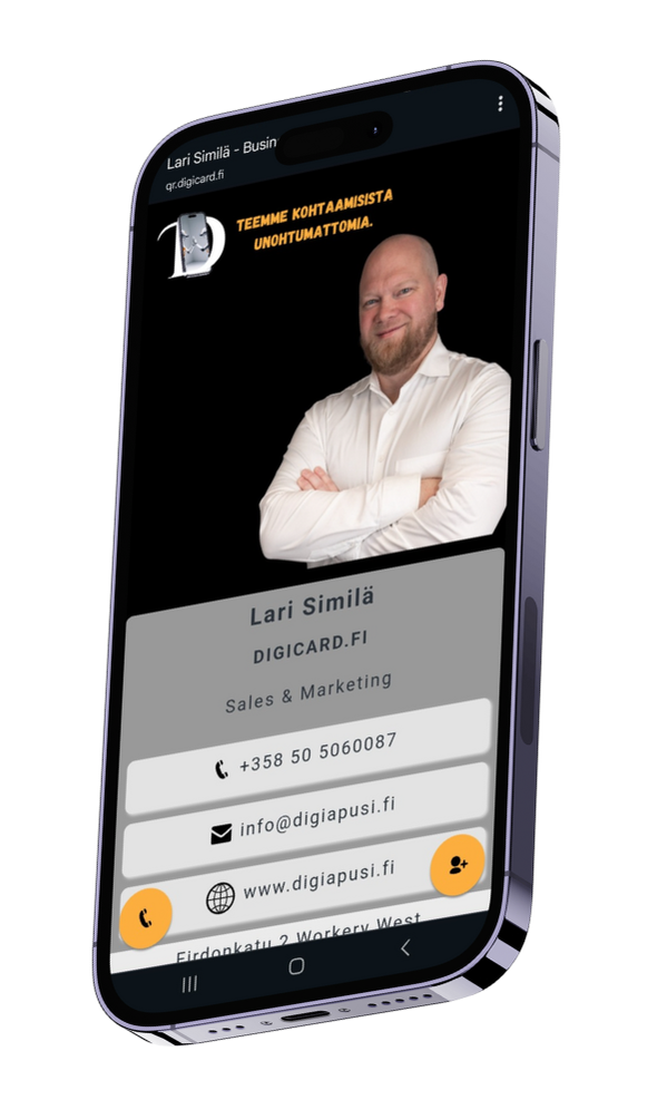 Digitaalinen käyntikortti tallentuu suoraan asiakkaan puhelimeen – nimi ja kuva tai logosi näkyvät, kun soitat. Enemmän vastattuja puheluita ja laadukkaita liidejä.