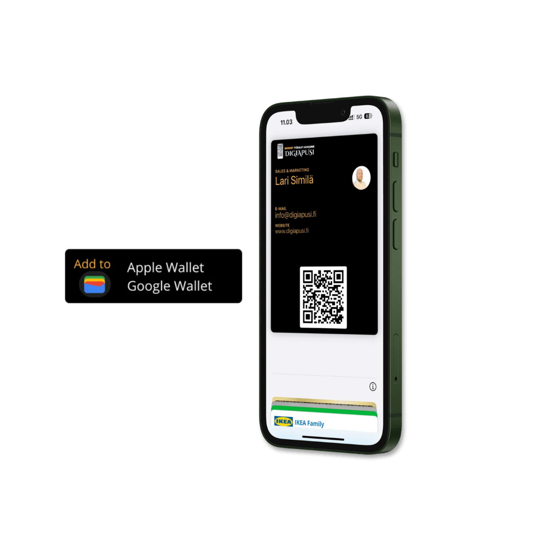 Digitaalien käyntikortti kulkee aina mukanasi puhelimessa. Et tarvitse erillisiä sovelluksia tai Bluetooth- tai NFC-yhteyttä.