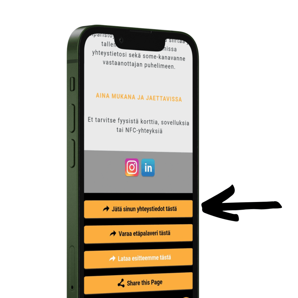 QR-koodi ja yhteystietosivu brändätään yrityksesi mukaiseksi logon, brändivärien, henkilönkuvan ja somekanavien avulla. Tällä digitaalisella käyntikortilla jäät varmasti asiakkaasi mieleen.